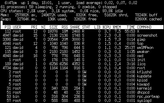 This will display a full screen of information about the processes running on the system, as well as some overall information about the system. This includes load average, number of proceses, the CPU status, free memory information, and details about processes including PID, user, priority, CPU and memory usage information, running time, and program name.